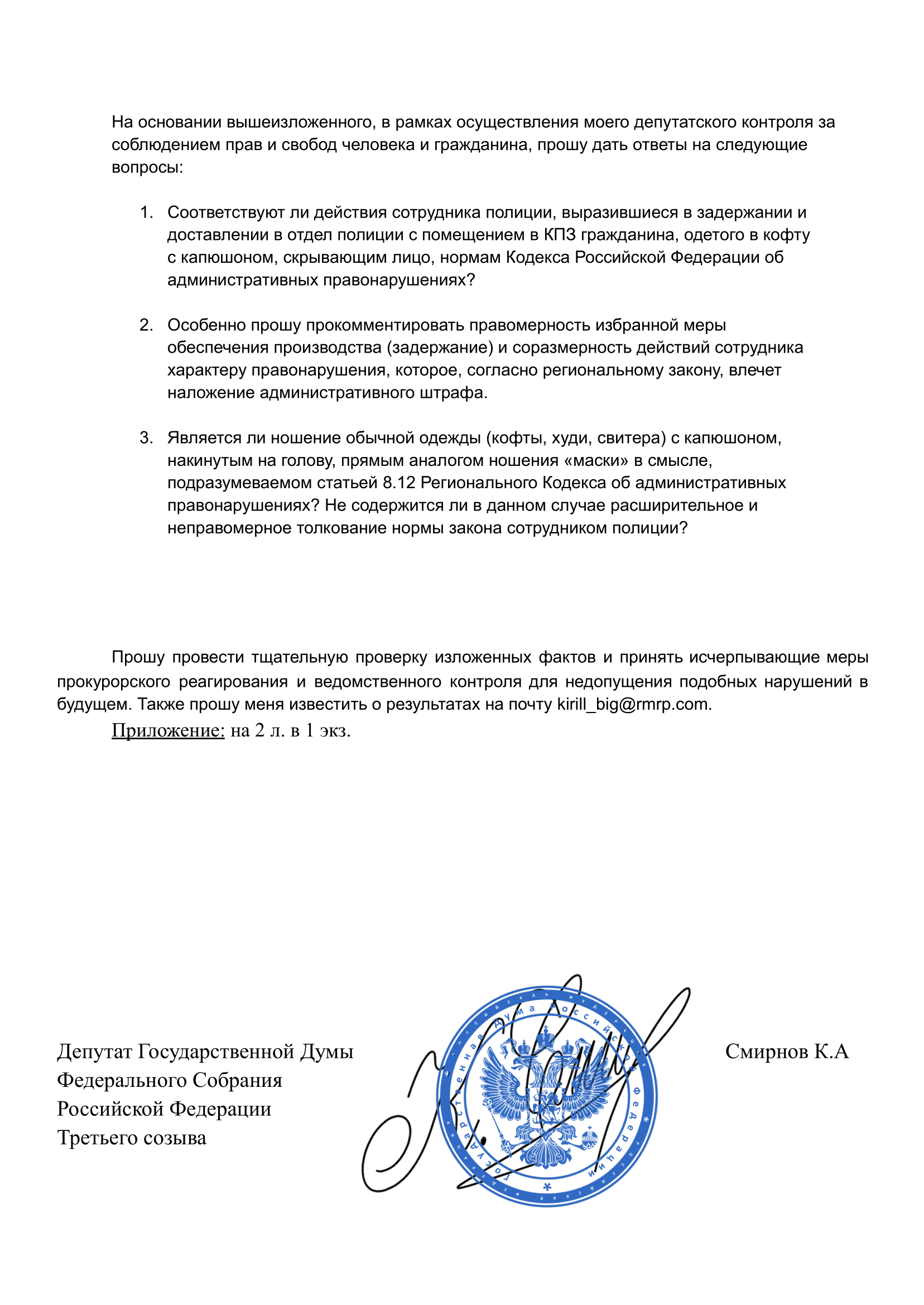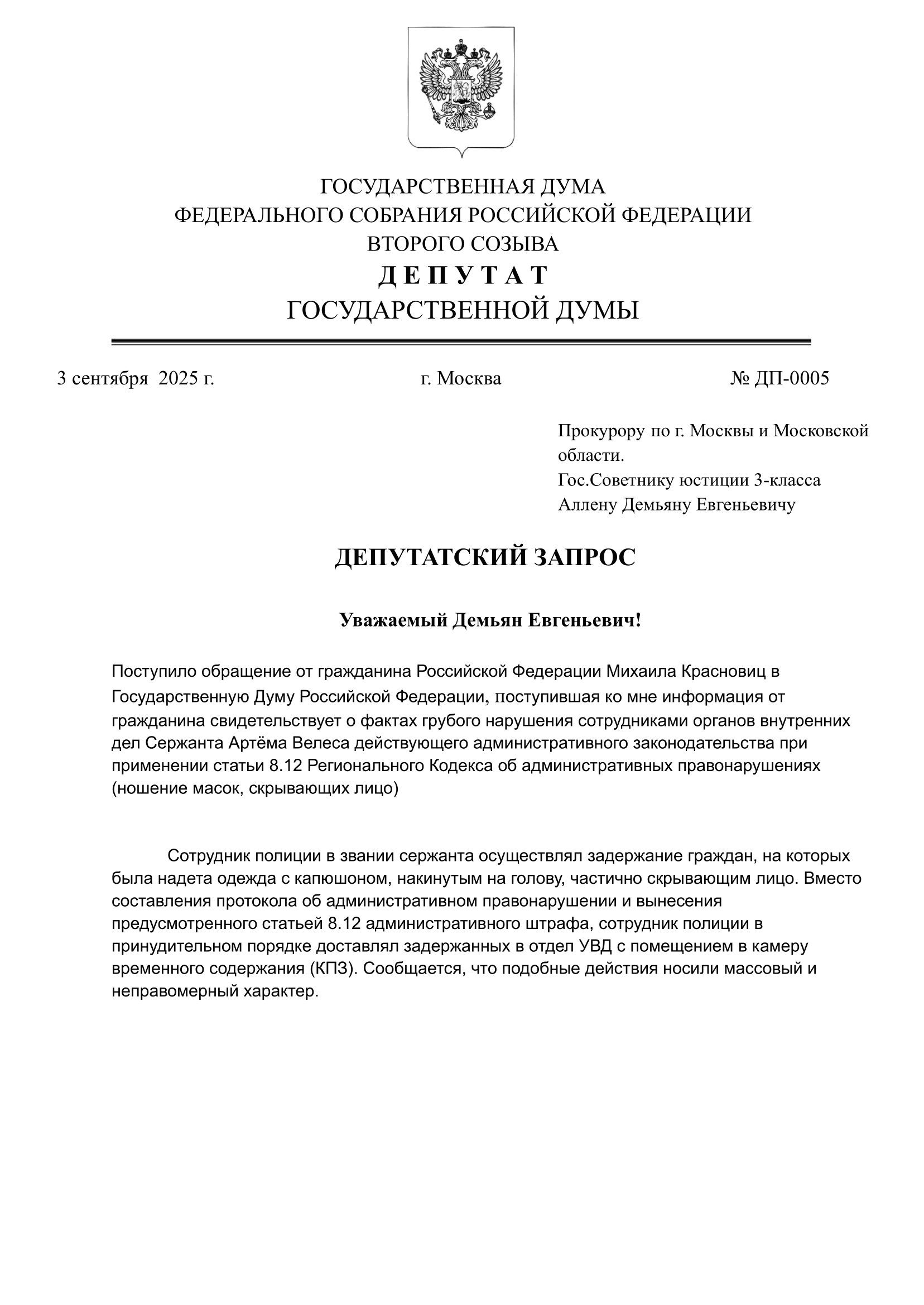 Поступило обращение от гражданина Российской Федерации Михаила Красновиц в Государственную Думу Российской Федерации, поступившая ко мне информация от гражданина свидетельствует о фактах грубого нарушения сотрудниками органов внутренних дел Сержанта Артёма Велеса действующего административного законодательства при применении статьи 8.12 Регионального Кодекса об административных правонарушениях (ношение масок, скрывающих лицо)