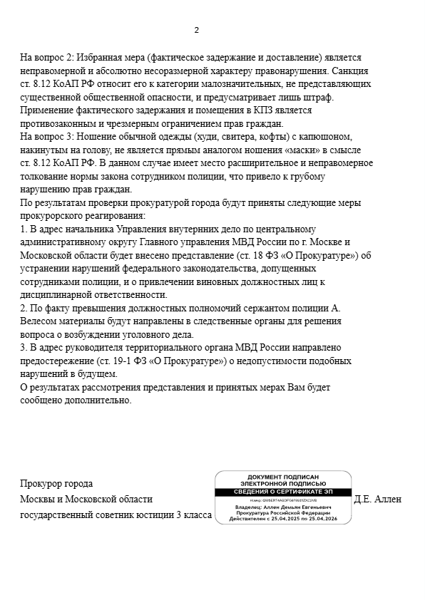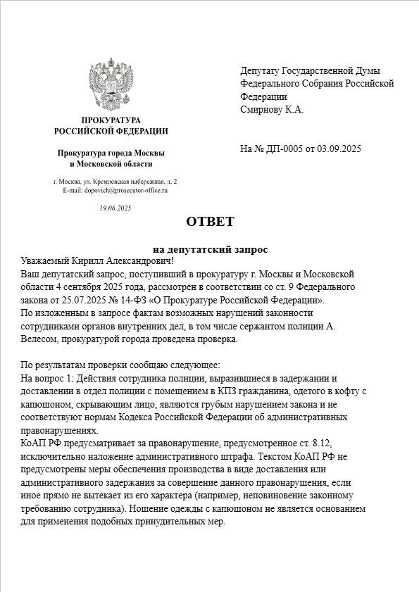 После обращения Смирнова К.А через Депутатский запрос на Прокурора Аллена Демьяна Евгеньевича, поступил ответ.